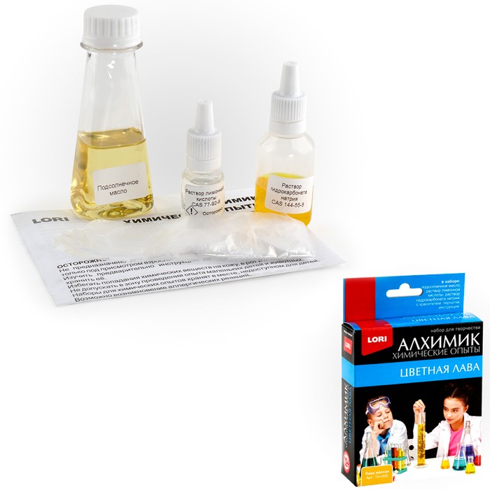 Комплектация: химические реактивы, подсолнечное масло, перчатки, инструкция Материал: реактивы, резина, масло, бумага Упаковка: картонная коробка с подвесом Размер упаковки: 11,5*13,5*4 см Возраст: 12+ Страна обладатель бренда: Россия Набор из серии "Химические опыты" наглядно продемонстрирует ребёнку интересные и несложные химические опыты, помогут освоить базовые знания, расширят кругозор и привьют интерес к науке. Опыты могут быть проведены в домашних условиях и в условиях школьной лаборатории в кабинете химии. Этот набор познакомит юных исследователей с процессои создания лава-лампы - прозрачной колбы с переливающимися каплями цветной массы.