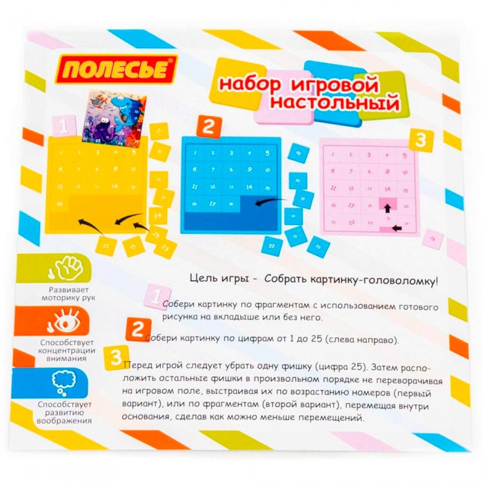 Размер упаковки: 22,3 х 1 х 25 см Размер изделия: 19 х 20 х 1 см Функционал: логическая игрушка Вид упаковки: пакет Страна производитель: Беларусь Материал: полимеры Комплектация: логическая игра - 1 шт Возраст ребенка: для детей от 3 лет Набор игровой настольный "Морские обитатели №1" - это игра, которая знакома многим с детства и способна увлечь не только детей, но и их родителей. Цель игры: собрать изображение, перемещая фишки. Особенности: - яркие и красочные картинки - вкладыш с готовым рисунком - различные варианты игры - безопасные материалы - компактный размер