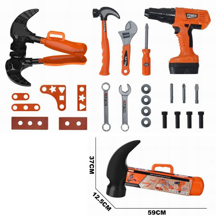 Размер упаковки: 59*12,5*37 см Функционал: игровой тематический набор, обучение профессии строителя Упаковка: пластиковый чемоданчик в виде молотка Страна обладатель бренда: КНР Материал: пластик Комплектация: инструменты, аксессуары Возраст ребенка: от 3 лет • Набор инструментов подойдет как для игр дома, так и для оформления уголка профессий в детском саду. • Стильный и продуманный набор станет хорошим подарком. • Для игр, имитирующих профессии, есть множество различных приборов и аксессуаров, которые позволят оборудовать игровой кабинет и организовать его пространство по образу и подобию взрослого. • Такие игры приучают к азам профессии, готовят ко взрослой жизни. • Набор для игры в строителя привлекает внимание не только своим ярким внешним видом, но и функциональностью. • Набор хорошо детализирован, все инструменты имитируют настоящие, отличаются точной проработкой элементов. • С ним малыш почувствует себя настоящим строителем и сможет отремонтировать игрушечную технику или