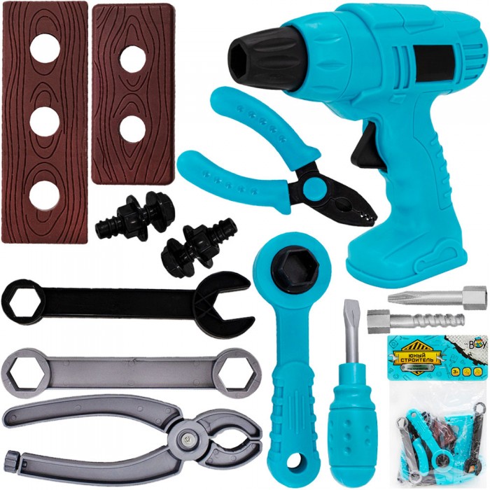 Размер упаковки: 29 х 20 х 3 см Упаковка: пакет с картонным цветным хедером Функционал: игрушки в наборах Вид: игровой набор – юный строитель Страна производитель: КНР Материал: пластик Комплектация: брусок для вкручивания с разным количеством отверстий (2 шт.), клещи, комбинированный ключ, накидной ключ, торцевой ключ, болт с гайкой (2 шт.), шуруп, плоскогубцы, шуруповёрт, отвёртка, насадка крестовая Возраст ребенка: для детей от 3+ лет. Игрушечные инструменты функционально идентичны взрослым аналогам и позволяют развивать мелкую моторику, координацию ребенка, точность движений. Набор «Юный строитель» помогает познакомить детей с основными особенностями взаимодействия отдельных частей и деталей, развивает пространственное воображение. Сюжетно-ролевая игра развивает воображение, познавательное мышление, формирует черты характера и коммуникативные способности, содействует приобретению навыков. Изделие выполнено из прочного и безопасного для детей пластика.