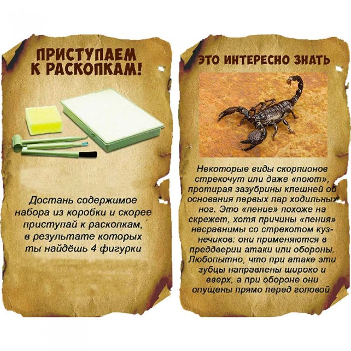 Размер упаковки: 12 х 8 х 21 см Вес: 667 г Функционал: набор для проведения раскопок Упаковка: картонная коробка Страна обладатель бренда: Россия Материал: гипс, пластик, дерево Комплектация: блок для раскопок - 1 шт., молоток - 1 шт., зубило - 1 шт., кисточка - 1 шт., губка - 1 шт., инструкция, фигурка - 1 шт. Возраст ребенка: от 6 лет Набор из серии «Раскопки» — увлекательная игра для любителей археологии. С помощью инструментов, входящих в набор, ребенок сможет снять с бруска слой гипса, откопать фигурку, а остатки гипса удалить щеточкой или при помощи воды. Игра способствует развитию: - усидчивости; - мелкой моторики; - воображения. Такой набор надолго увлечет ребёнка в мир древних загадок.