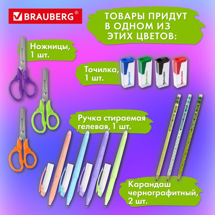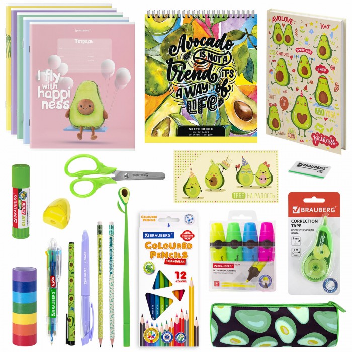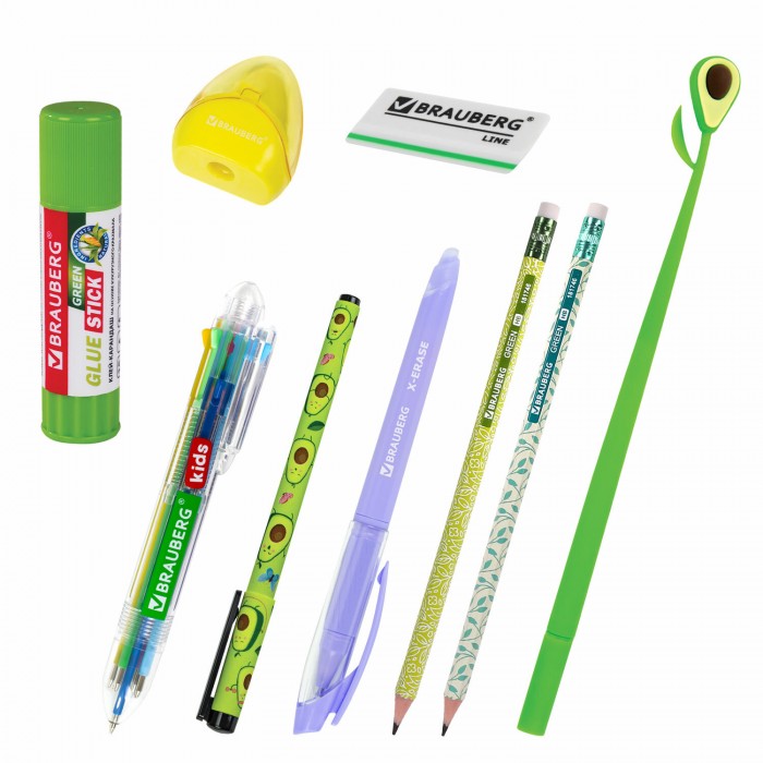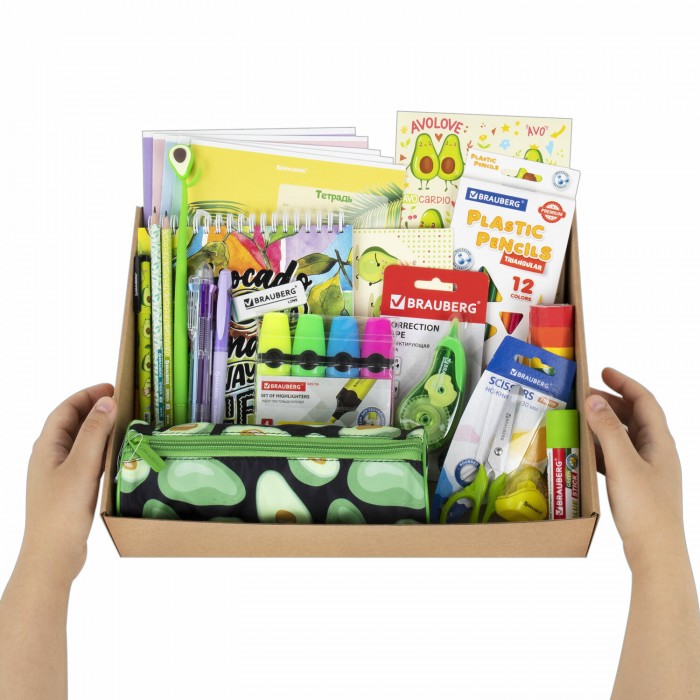 Большой набор канцелярских принадлежностей BRAUBERG "AVOCADO" в подарочной упаковке скомпонован из самых необходимых предметов одной тематики, за счет чего смотрится ярко и и интересно.