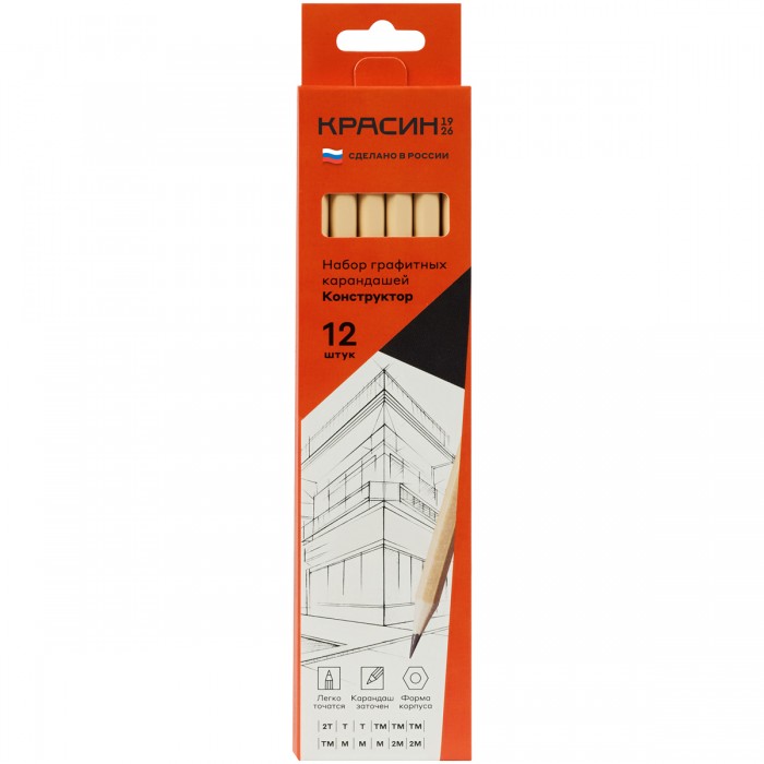 Набор чернографитных карандашей КРАСИН серии «Конструктор» 12 штук предназначен для проектно-конструкторских работ любой сложности. В наборе представлены пять степеней твердости: 2Т (2H), Т(H)-2, ТМ (HB)-4, М (B)-3, 2М (2B)-2. Корпус выполнен из качественной химически необработанной российской древесины – липы, имеет шестигранное сечение. Высококачественный ударопрочный грифель не крошится и не ломается при заточке. Карандаши поставляются заточенными, имеют диаметр 7 мм и длину 177 мм. Набор упакован в картонную коробку. Карандаши легко и равно затачиваются Карандаши изготовлены по технологии двойной тотальной склейки DSA, которая увеличивает прочность и надежность заклейки стержня в карандаше, предохраняет его от повреждений при падении, ударе и намокании. Технология не изменяет цвет, упругость, прочность и чиночные свойства древесины в местах склейки. Безупречное качество даже для самых серьезных профессионалов! • Твердость: 2Т (2H), Т(H)-2, ТМ (HB)-4, М (B)-3, 2М (2B)-2; • Заточенный грифель: да; • Форма корпуса: шестигранная; • Количество штук в упаковке: 12.