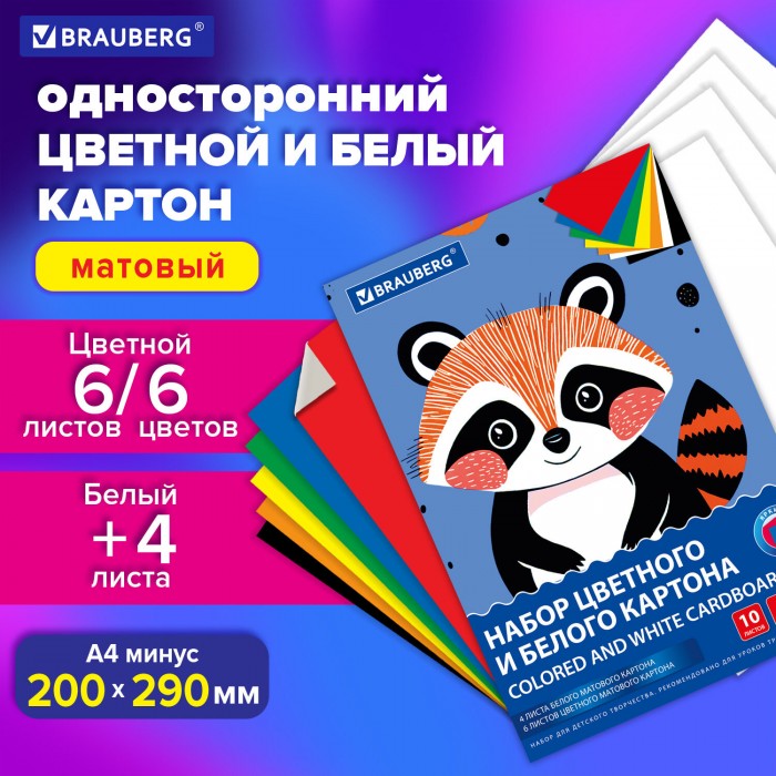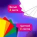 Набор картона БЕЛЫЙ + ЦВЕТНОЙ А4 немелованный, 10 листов (белый 4 листа + цветной 6 листов), в папке, 116631
