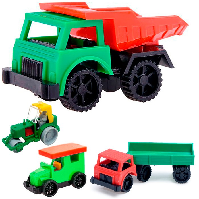 Набор: Каток, самосвал, полуприцеп, фаэтон: • Состоит из пластмассы. • Соответствует требованиям безопасности продукции. • Для детей от 3-х лет.