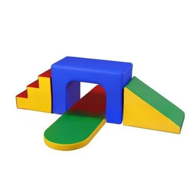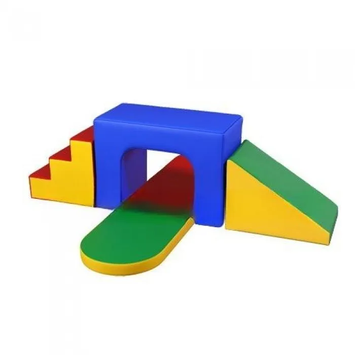 Кожзам и Поролон. Состоит из 5ти модулей. Мат радиусный: 1000х400х40мм - 2 шт. Блок с аркой: 700х500х700мм - 1 шт. Трапеция: 800х500х600мм - 1 шт. Ступени: 750х500х600мм - 1 шт. Цвета: Красный,Синий,Желтый,Зеленый (вес 19кг 0,74м/куб)