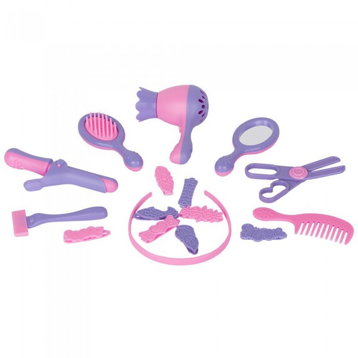 • В наборе: - расчёска (12х4см), - ножницы (12х6см), - пройка (15х5х2,5см), - бритвенный станок (11х4см), - фен (9х5,5х12см), - ободок (12х12,5см), - заколка 8 шт.(5см), - массажная расчёска (12,5х5,5см), - зеркало (12,5х5,5см). • Материал: пластмасса. • Соответствует требованиям безопасности и стандартам качества продукции. • Для детей от 3-х лет.