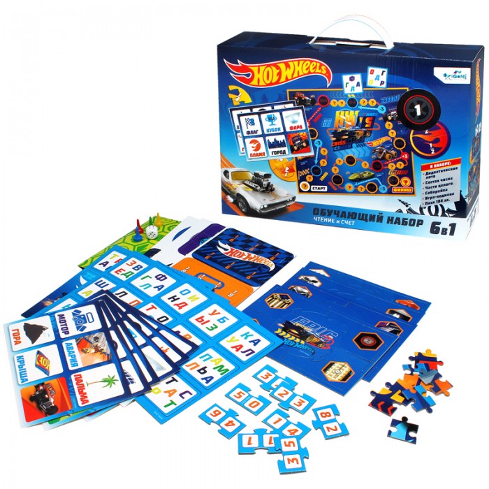 Обучающий набор 6в1 создан для эффективных занятий с ребенком. Внутри красивой подарочной коробки, выполненной в дизайне Hot Wheels, вы найдете все для развития навыка чтения и счета. Все задания в игровой форме и включают в себя дидактическое лото, изучение состава числа и части целого. Набор «собери слово» и настольная игра с вопросами помогают улучшить речь и мышление