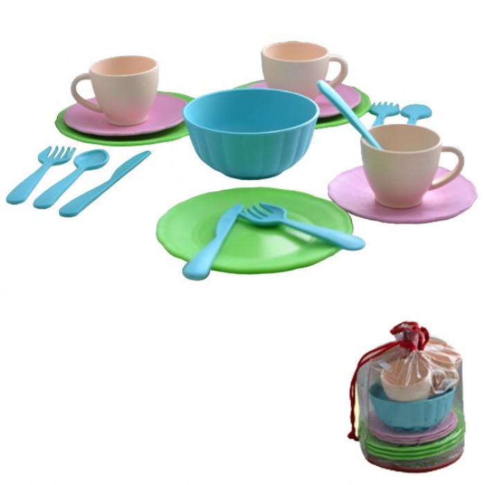 Размеры упаковки-14x14x17см • В наборе: - чашки (3 шт.) - 7.5х6х4.5 см. - маленькие блюдца (3 шт.) - 11х11. - большие блюдца (3 шт.) -13.5х13.5 см. - салатник - 10.5х10.5х5 см. - 3 вилки. - 3 ложки. - 2 ножа. • Материал: пластик. • Соответствует требованиям безопасности и стандартам качества продукции. • Для детей от 3-х лет.