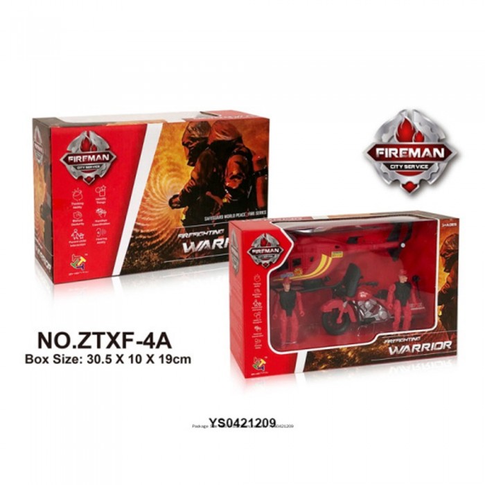 Размер упаковки: 30,5 х 10 х 19 см Размер изделия: фигурка пожарного 5 х 0,4 х 9,5 см, мотоцикл 6 х 4 х 10 см, вертолет 26 х 6 х 10 см Функционал: детский игровой набор, набор пожарного Вид упаковки: картонная коробка блистерного типа Страна производитель: КНР Материал: полимеры Комплектация: фигурки пожарного - 2 шт, вертолет - 1 шт, мотоцикл - 1 шт Возраст ребенка: для детей от 3 лет С таким набором ребенок примерит на себя роль пожарного, больше узнает об этой профессии и инструментах, которые они используют. Играя, дети смогут развивать: - воображение - социальные навыки - учиться ладить друг с другом во время совместной игры - разрабатывая стратегии Особенности: - игрушки с подвижными элементами - выполнены их качественных материалов - игрушка не боится механического воздействия - устойчивыми к внешнему воздействию