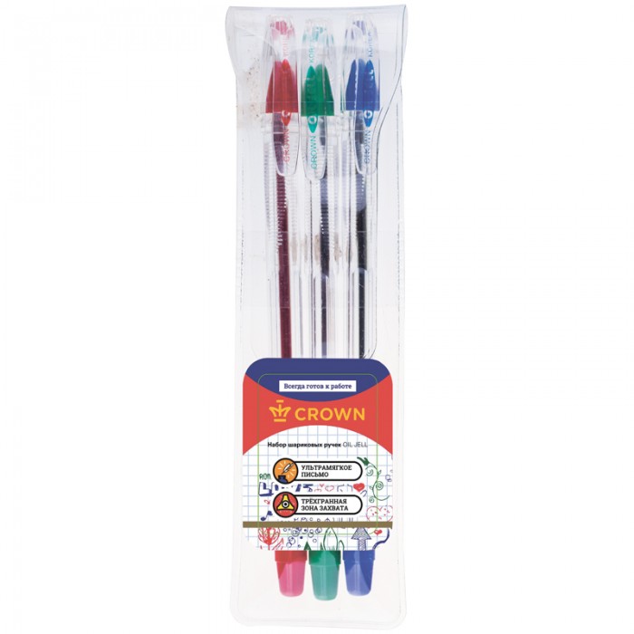 Набор шариковых ручек Crown "Oil Jell" 3шт., 03цв., 0,7мм, ПВХ уп., европодвес