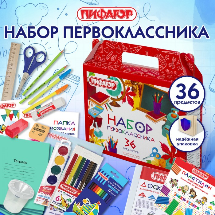 Набор школьных принадлежностей в подарочной коробке ПИФАГОР "НАБОР ПЕРВОКЛАССНИКА", 36 предметов, 880121
