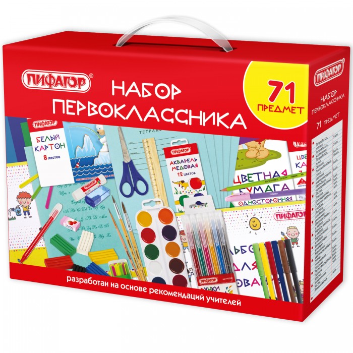 Набор школьных принадлежностей в подарочной коробке ПИФАГОР "НАБОР ПЕРВОКЛАССНИКА", 71 предмет, 881132