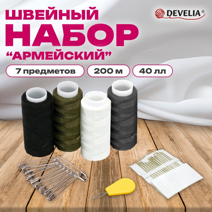 Набор швейный "Армейский", 40ЛЛ, 200 м, 4 цвета, иглы, нитевдеватель, булавки, DEVELIA (Девелиа), 609631