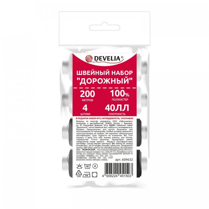 Набор швейный "Дорожный" 40ЛЛ, 200 м, 2бел/2черн, иглы, нитевдеватель, булавки, DEVELIA (Девелиа), 609632