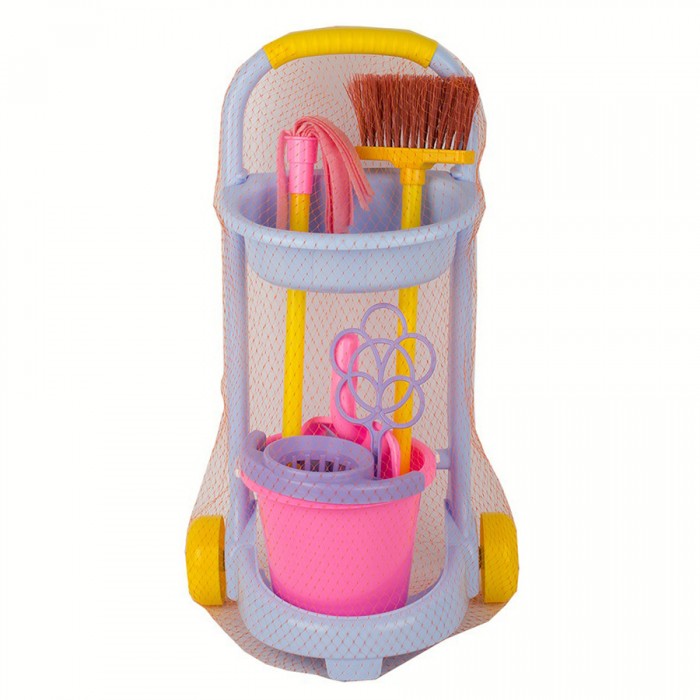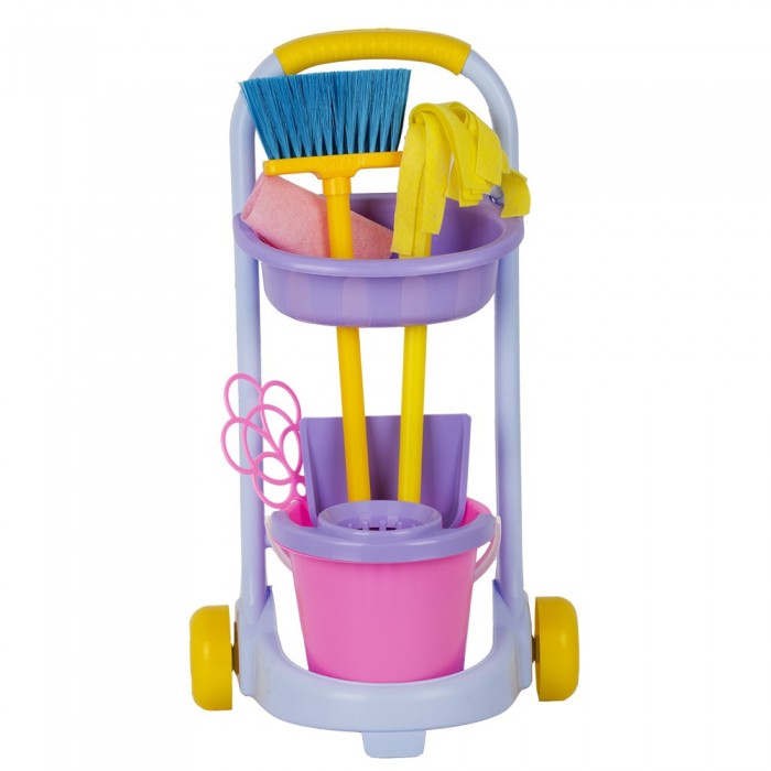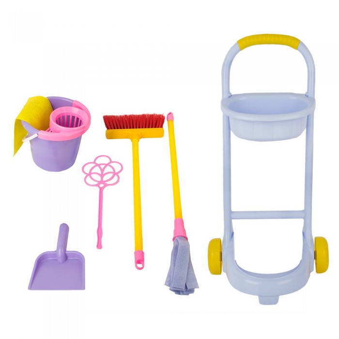 • В наборе: - тележка. - швабра с текстильной насадкой (48 см.). - щетка (51 см.). - совок. - ведро. - салфетка текстильная. - пылевыбивалка для ковра. • Размеры тележки: 35х33х62 см. • Материал: пластик. • Соответствует требованиям безопасности и стандартам качества продукции. • Для детей от 3-х лет.