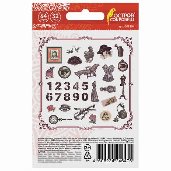 Наклейки для скрапбукинга ВИНТАЖ из washi-бумаги, 64 штуки, 32 дизайна, ОСТРОВ СОКРОВИЩ, 662264