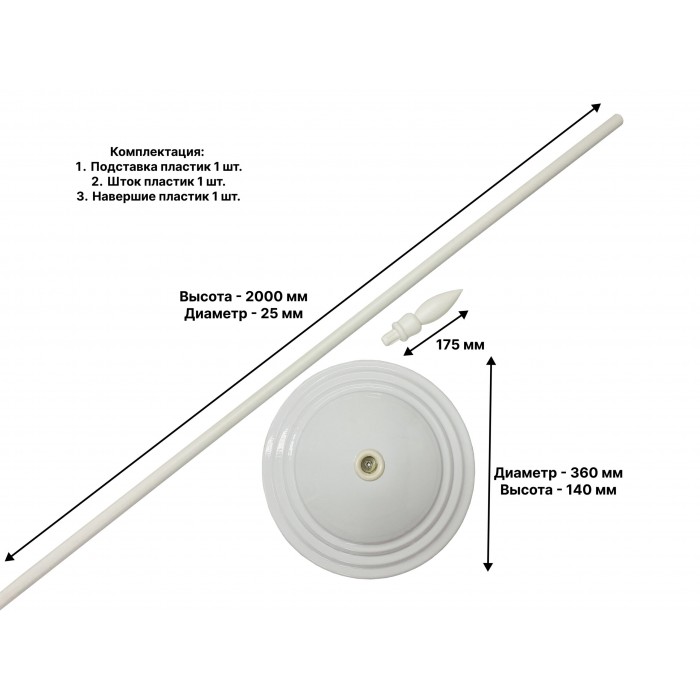 Комплект состоит из основания материал полистирол, основание с отверстиями для флагштоков, утяжеление лист ДСП, флагштоки материал ПВХ, навершие материал ПНД.