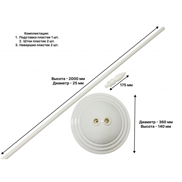 Комплект состоит из основания материал полистирол, основание с отверстиями для флагштоков, утяжеление лист ДСП, флагштоки материал ПВХ, навершие материал ПНД.