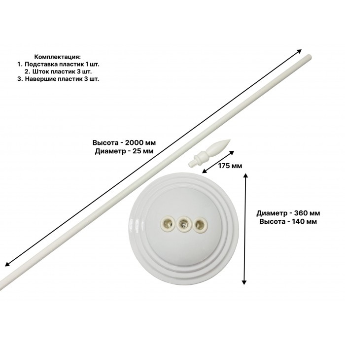 Комплект состоит из основания материал полистирол, основание с отверстиями для флагштоков, утяжеление лист ДСП, флагштоки материал ПВХ, навершие материал ПНД.