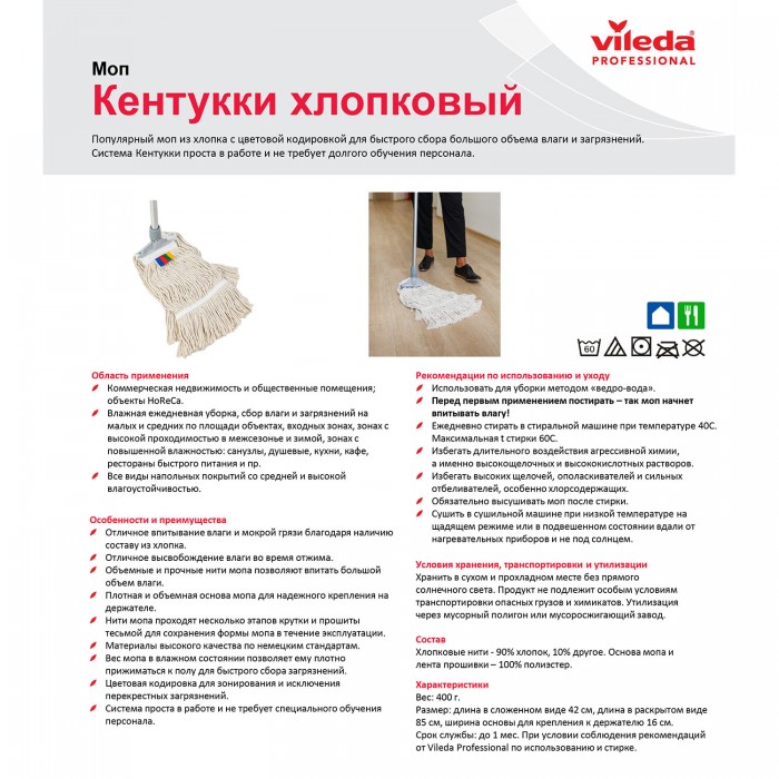 Насадка "Кентукки" - экономичная хлопковая насадка. Обладает великолепными впитывающими свойствами. Подходит для уборки средних и больших площадей. Для всех видов полов.