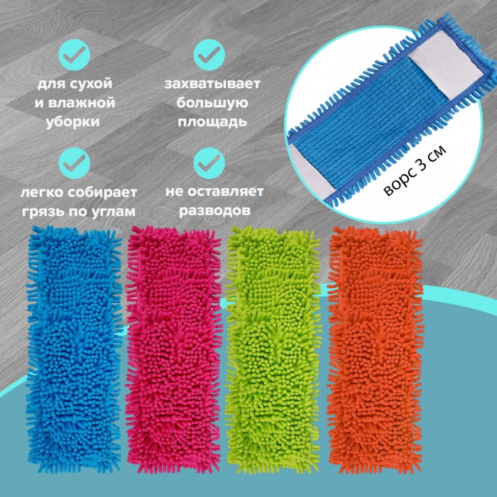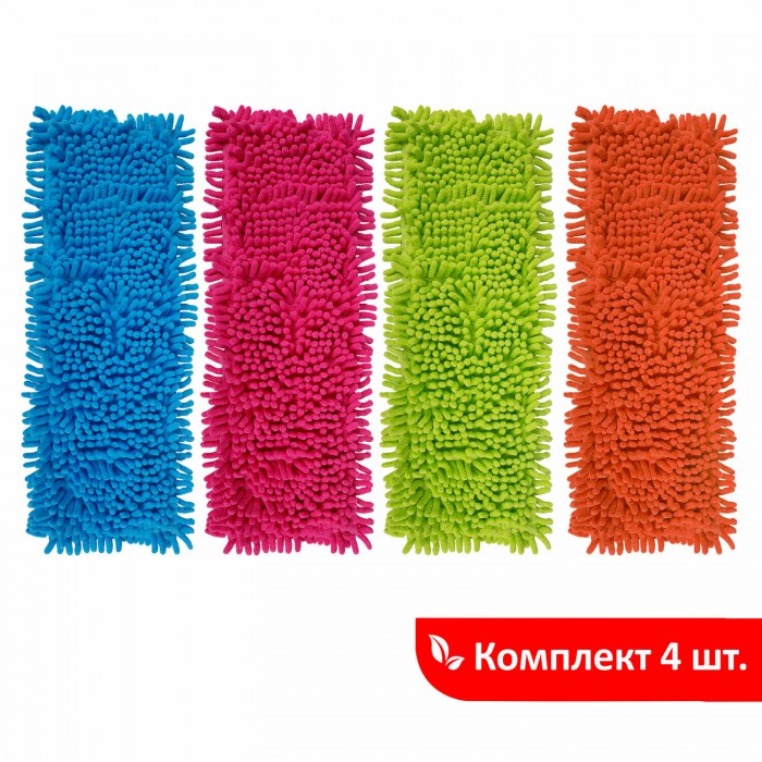 Комплект из 4-х ярких насадок МОП из микрофибры букли/синель LAIMA предназначен для проведения сухой и влажной уборки помещений. Разные цвета можно применять в разных помещениях. Имеет повышенную впитываемость. МОПы УНИВЕРСАЛЬНЫЕ для флаундеров 38-42 см.