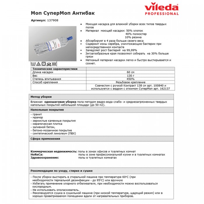 Нетканый материл, используемый в насадке "Антибак", имеет ряд преимуществ по сравнению с хлопковыми МОПами. Нетканая структура и смесь из хлопка и полиэстера дают высокую степень абсорбции – впитывает в 4 раза больше собственного веса.