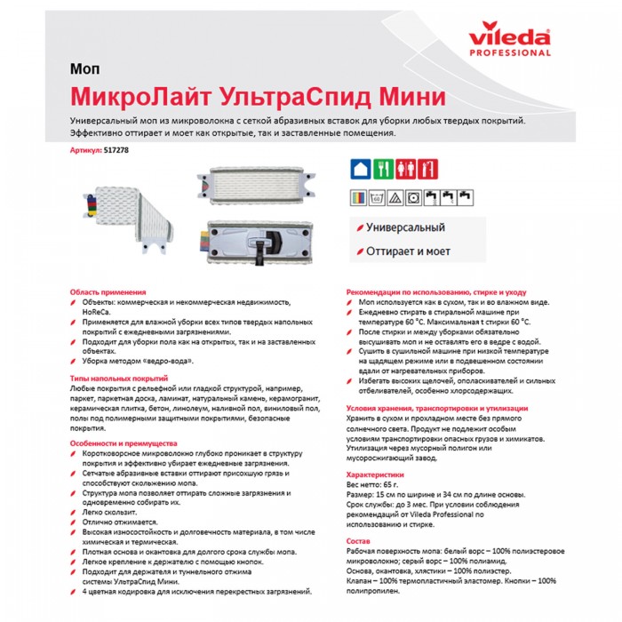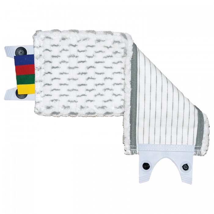 Микроволоконная насадка прекрасно удаляет любые загрязнения. Может использоваться как в сухом, так и во влажном виде. Имеет цветовую кодировку для разграничения зон уборки.