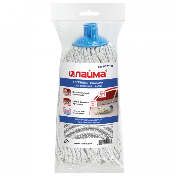Насадка МОП веревочная для швабры, крепление еврорезьба, хлопок, длина 31 см, 220 г, LAIMA, 603789