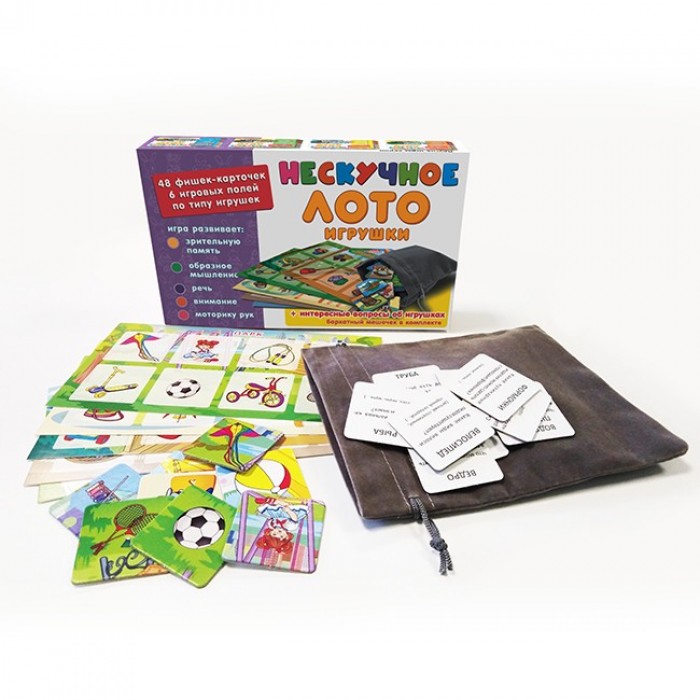 Комплектация: игровые картонные поля - 6 шт., карточки - 48 шт., бархатный мешочек Материал: картон, пластик Упаковка: картонная коробка Размер упаковки: 12,5*4*21 см Возраст: 3+ Страна обладатель бренда: Россия Лото - общеизвестная и любимая всеми игра, которая отлично подойдёт как для семейного досуга, так и для большой шумной компании. Яркое лото - увлекательная настольная игра для развития памяти. Лото - это веселая настольная игра для дружной компании. Лото состоит из небольших фишек и картонных игровых полей с изображением различных игрушек. Правила лото просты и понятны, ничем не отличаются от обыкновенного лото. Ведущий поочередно вытягивает фишки, а игроки заполняют ими свои карточки. Победителем считается тот, кто быстрее всего соберет всю «коллекцию» фишек, изображенных на его карточке.