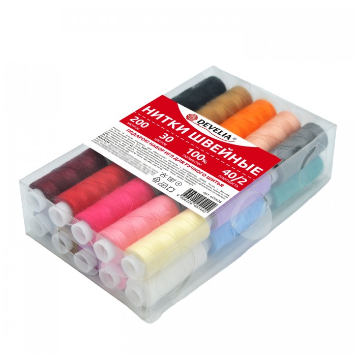 Нитки швейные 40/2 200 м, полиэстер, НАБОР 30 цветов, в ПОДАРОК набор игл, DEVELIA (Девелиа), 609626