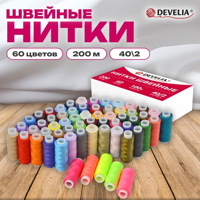 Нитки швейные 40/2 200 м, полиэстер, НАБОР 60 цветов, DEVELIA (Девелиа), 609629