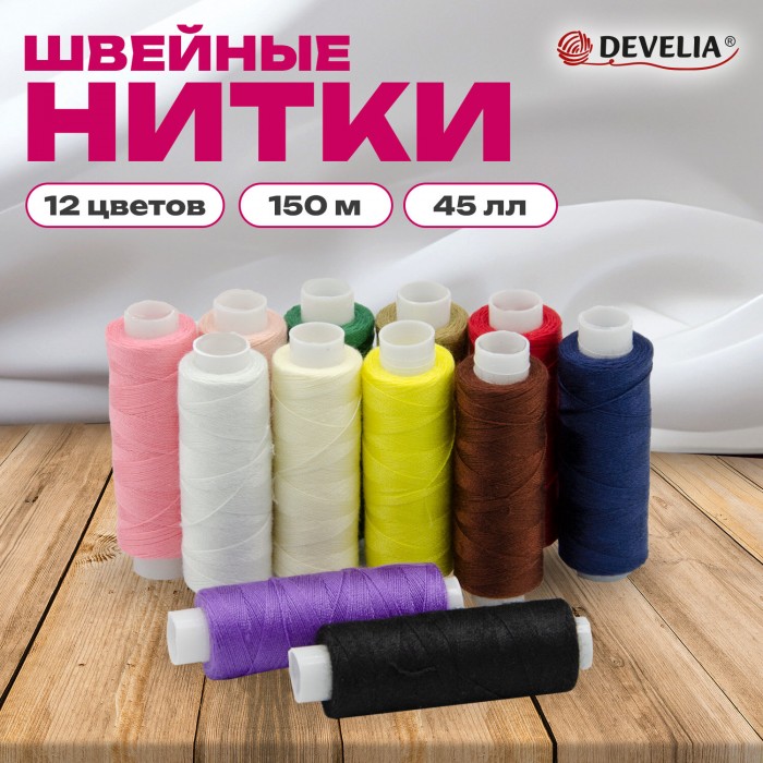 Нитки швейные 45ЛЛ 150 м, полиэстер, НАБОР 12 цветов, DEVELIA (Девелиа), 609618