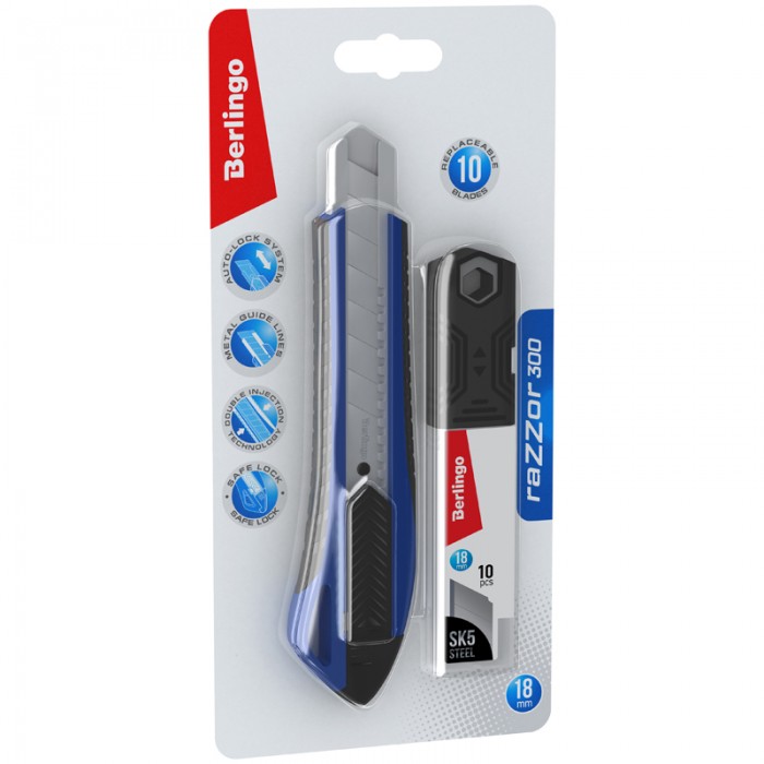 Нож канцелярский 18мм Berlingo "Razzor 300", синий + лезвия сменные 10шт., блистер, европодвес