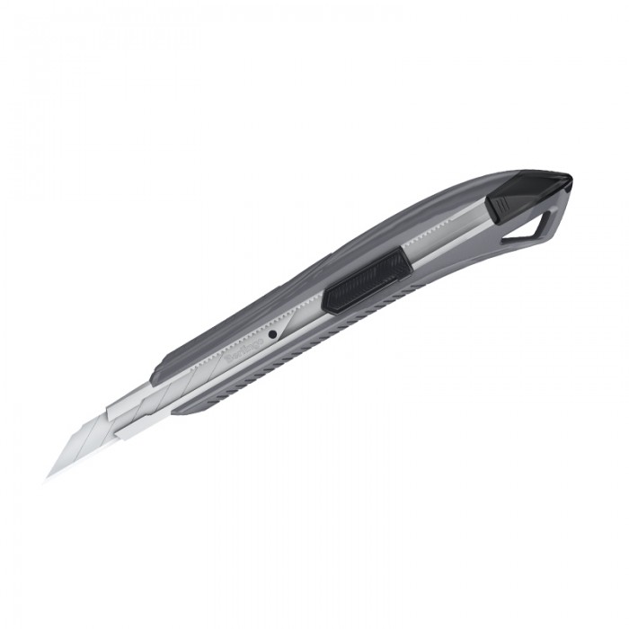 Серия "Razzor 200". Нож канцелярский с системой автоматической фиксации лезвия auto-lock. Корпус ножа выполнен из высококачественного ABS пластика. Имеет металлические направляющие. Комплектуется износостойким лезвием из стали SK5 с углом 30°. Ширина лезвия - 9 мм. Индивидуальная упаковка - блистер с европодвесом. На оборотной стороне блистера есть перфорация для более удобного извлечения инструмента из упаковки.
