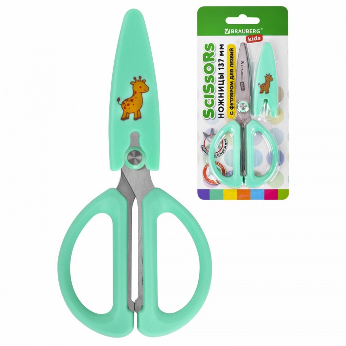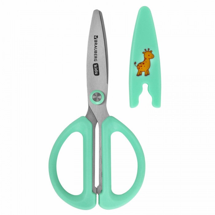 Ножницы 137 мм, резиновые рукоятки, пастельный мятный, чехол на лезвии, BRAUBERG KIDS, 238354