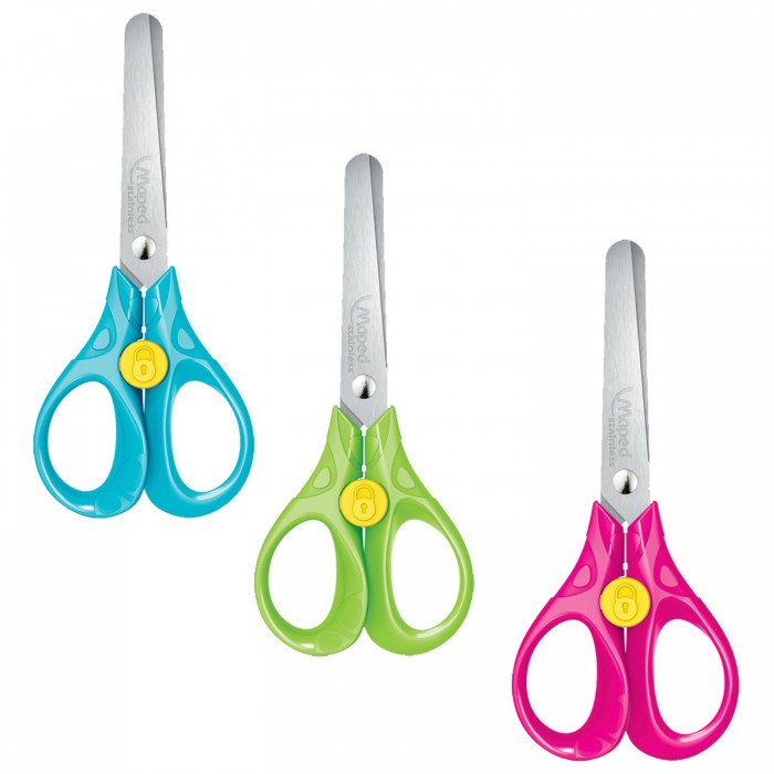 Школьные ножницы MAPED "Security 3D" оснащены уникальной системой блокировки лезвий для повышения безопасности - для использования достаточно нажать жёлтую кнопку с замочком для снятия блокировки. Подойдут для детей от 4-х лет.