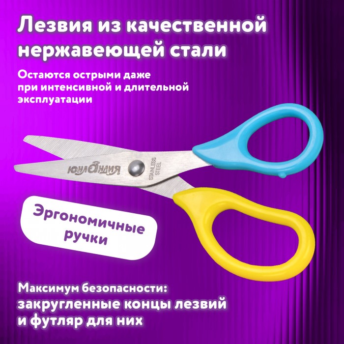 Ножницы ЮНЛАНДИЯ разработаны специально для детского творчества. Техника работы этим инструментом требует координации обеих рук, так как они одновременно выполняют разные движения. Это положительно влияет на развитие мелкой моторики и образного мышления.