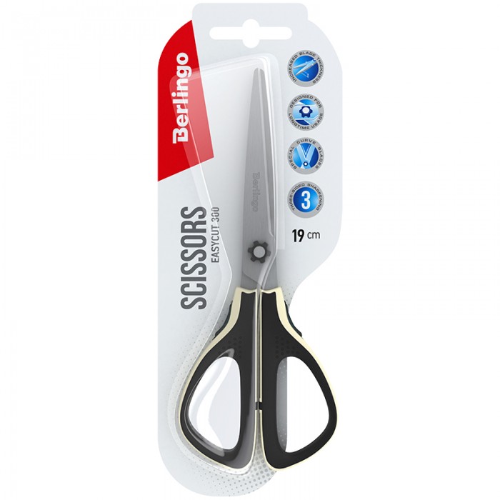 Ножницы Berlingo "Easycut 300", 19см, белые, мягкие вставки, европодвес