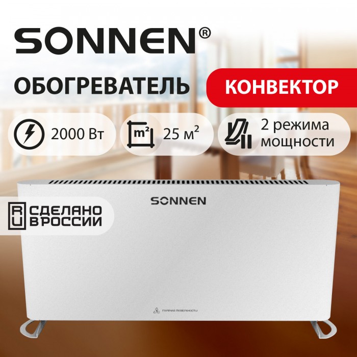 Обогреватель-конвектор SONNEN ONYX-2000.1, 2000 Вт, Х-образный нагревательный элемент, белый, сделано в России, 457630