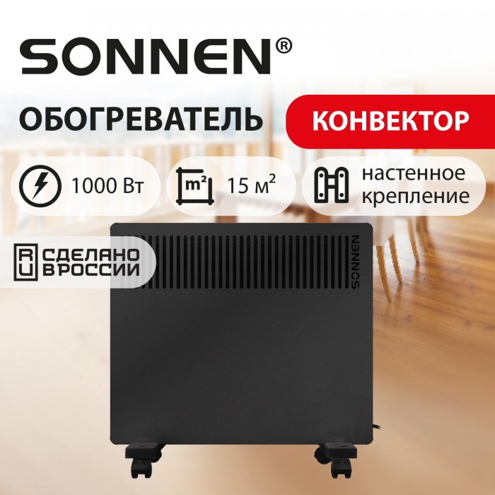 Обогреватель-конвектор SONNEN TEPLO-10, 1000 Вт, Х-образный нагревательный элемент, черный, сделано в России, 457627