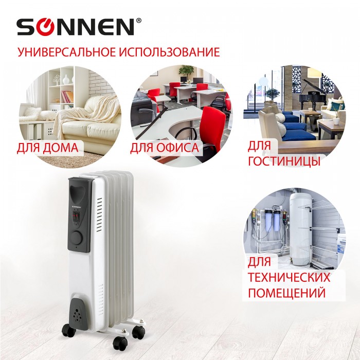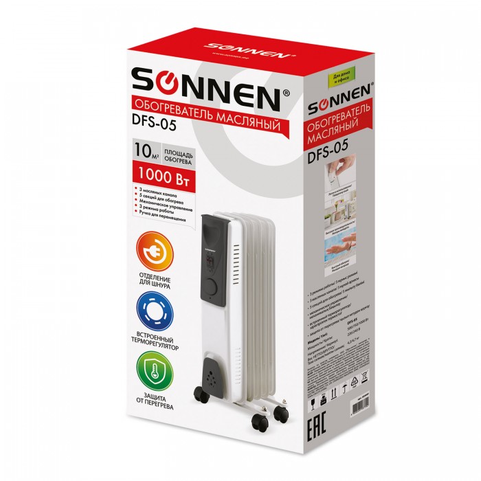 Масляный обогреватель SONNEN DFS-05 предназначен для обогрева помещений площадью до 10 м2, то есть будет незаменим на даче, в офисе и дома.