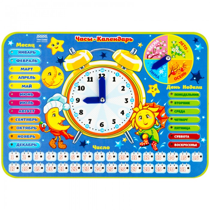 Обучающая игра часы-календарь «Будильник» представляет собой красочный деревянный планшет с подвижными стрелками и съёмными пластиковыми деталями-указателями. Игрушка «ТРИ СОВЫ» обучает ребенка ориентироваться во времени, погоде и явлениях природы, помогает изучить дни недели, месяцы, времена года. • Материал: ДВП высокой плотности, бумага; • Размер фигурки: 19,5*27,5 см; • Подходит: для мальчиков и девочек.