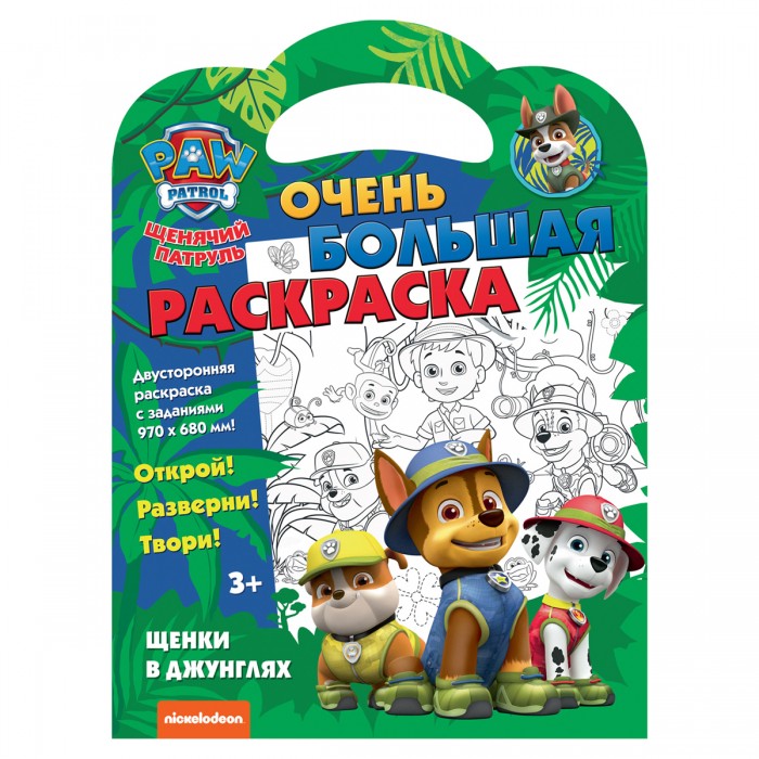 Очень большая раскраска «Щенячий патруль. Щенки в джунглях» − подарок для всех, кто любит рисовать и раскрашивать! Двусторонняя раскраска размером 970х680 мм сложена в книгу с яркой обложкой. Специальная картонная ручка позволяет носить раскраску с собой. С помощью раскраски ребенок сможет: • Развить творческие способности, фантазию и усидчивость • Рисовать прямо на полу с друзьями и родителями • Использовать всевозможные сочетания цветов • Повесить большой плакат с рисунком на стену