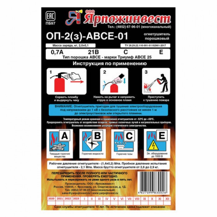 Огнетушитель порошковый ОП-2, АВСЕ (твердые, жидкие, газообразные вещества, электрические установки) закачной, ЗПУ Алюм, ЯРПОЖ, УТ-00001627