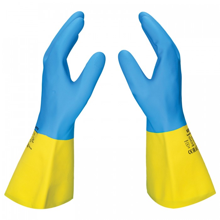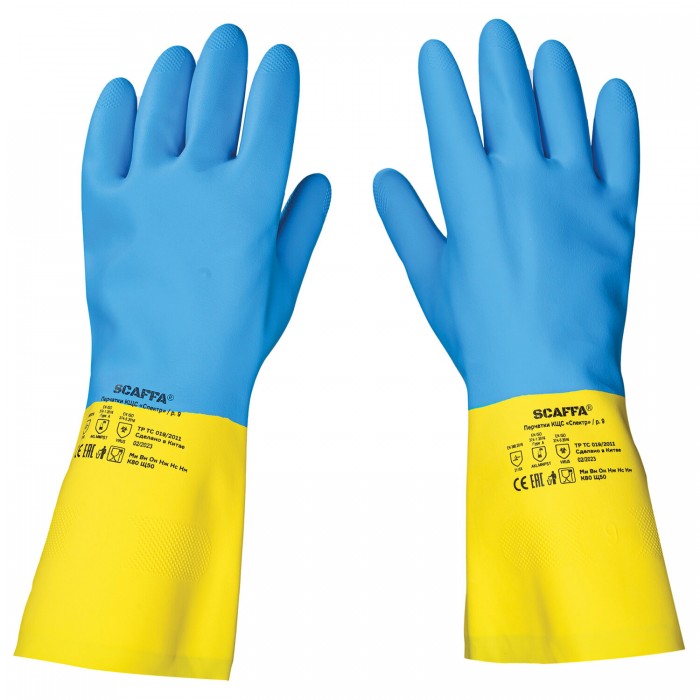 Перчатки от химических воздействий SCAFFA Спектр КЩС (растворов кислот концентрацией 80%, растворов щелочей концентрацией 50%) с хлопчатобумажным напылением, текстурированной рабочей поверхностью. Безопасны для контакта с пищевыми продуктами