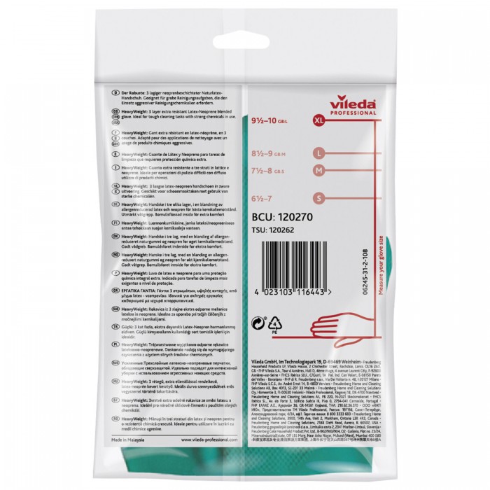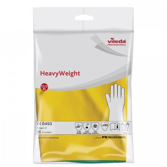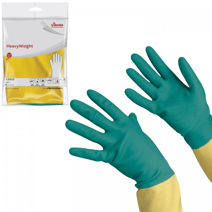 Перчатки МНОГОРАЗОВЫЕ латексные VILEDA, х/б напыление, СВЕРХПРОЧНЫЕ (неопрен), размер XL (очень большой), зелено-желтый, вес 130 г, 174309