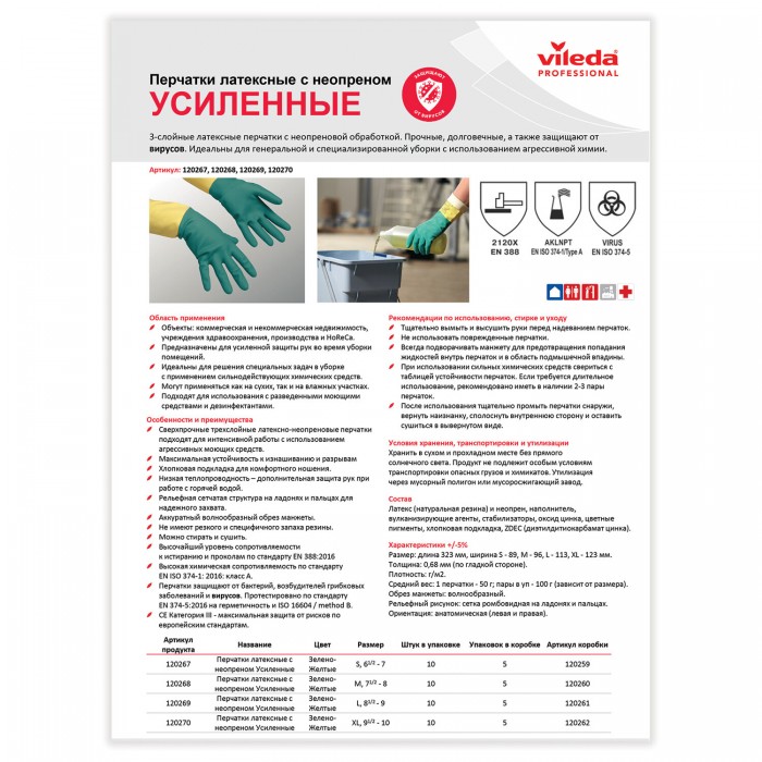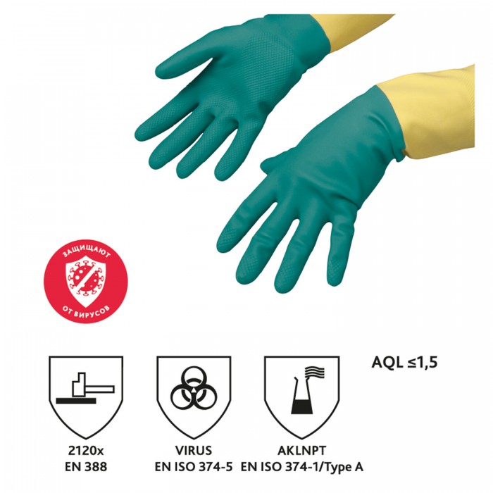 Усиленные перчатки для специальных работ изготовлены из натурального латекса с неопреновой обработкой, что делает их необыкновенно прочными. Защищают от агрессивной химии, очень стойкие к механическому воздействию, обеспечивают комфорт при уборке.