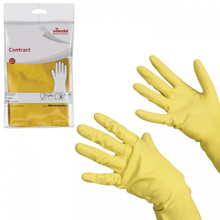 Перчатки МНОГОРАЗОВЫЕ резиновые VILEDA "Контракт", хлопчатобумажное напыление, размер L (большой), желтые, вес 60 г, 174325