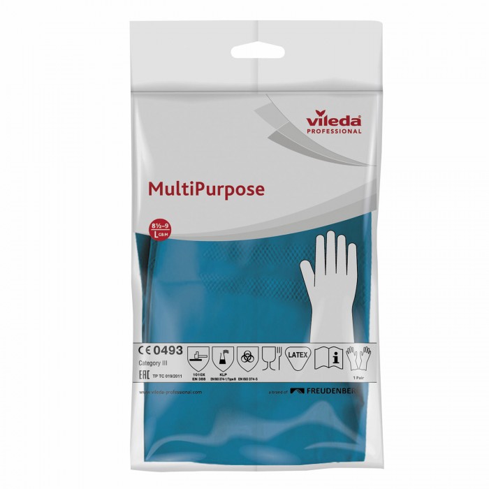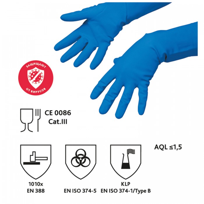 Перчатки МНОГОРАЗОВЫЕ резиновые VILEDA многоцелевые, хлопчатобумажное напыление, ПРОЧНЫЕ, размер L (большой), синий, вес 66 г, 174355